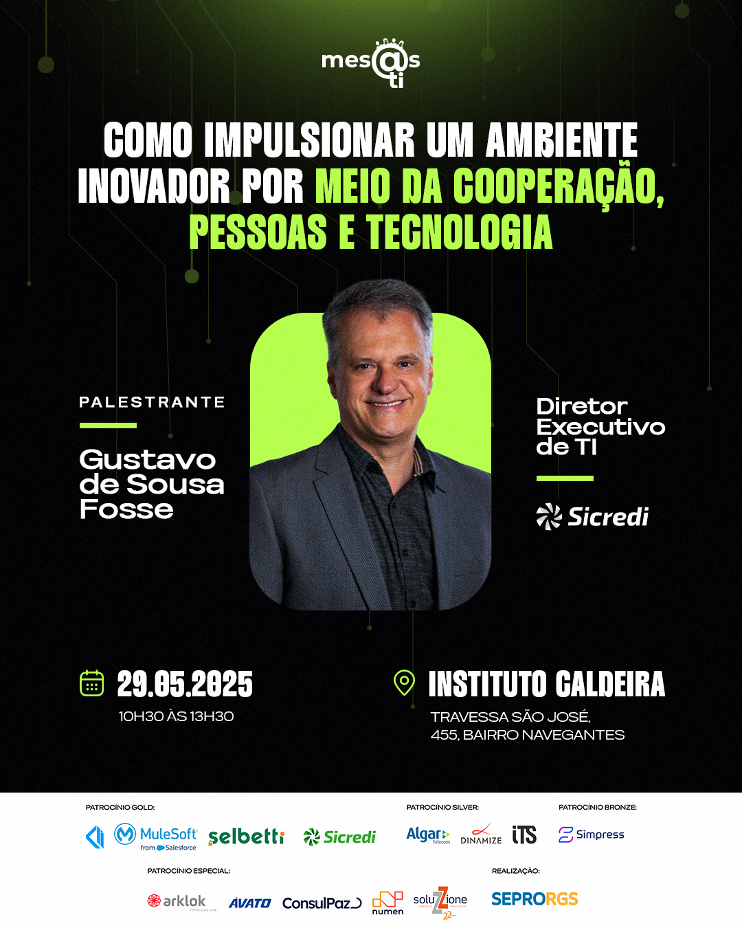 Nesta edição, teremos a presença de Gustavo de Sousa Fosse, Diretor Executivo de TI do Sicredi, com uma palestra sobre como a cooperação, as pessoas e a tecnologia são os pilares para ambientes verdadeiramente inovadores.